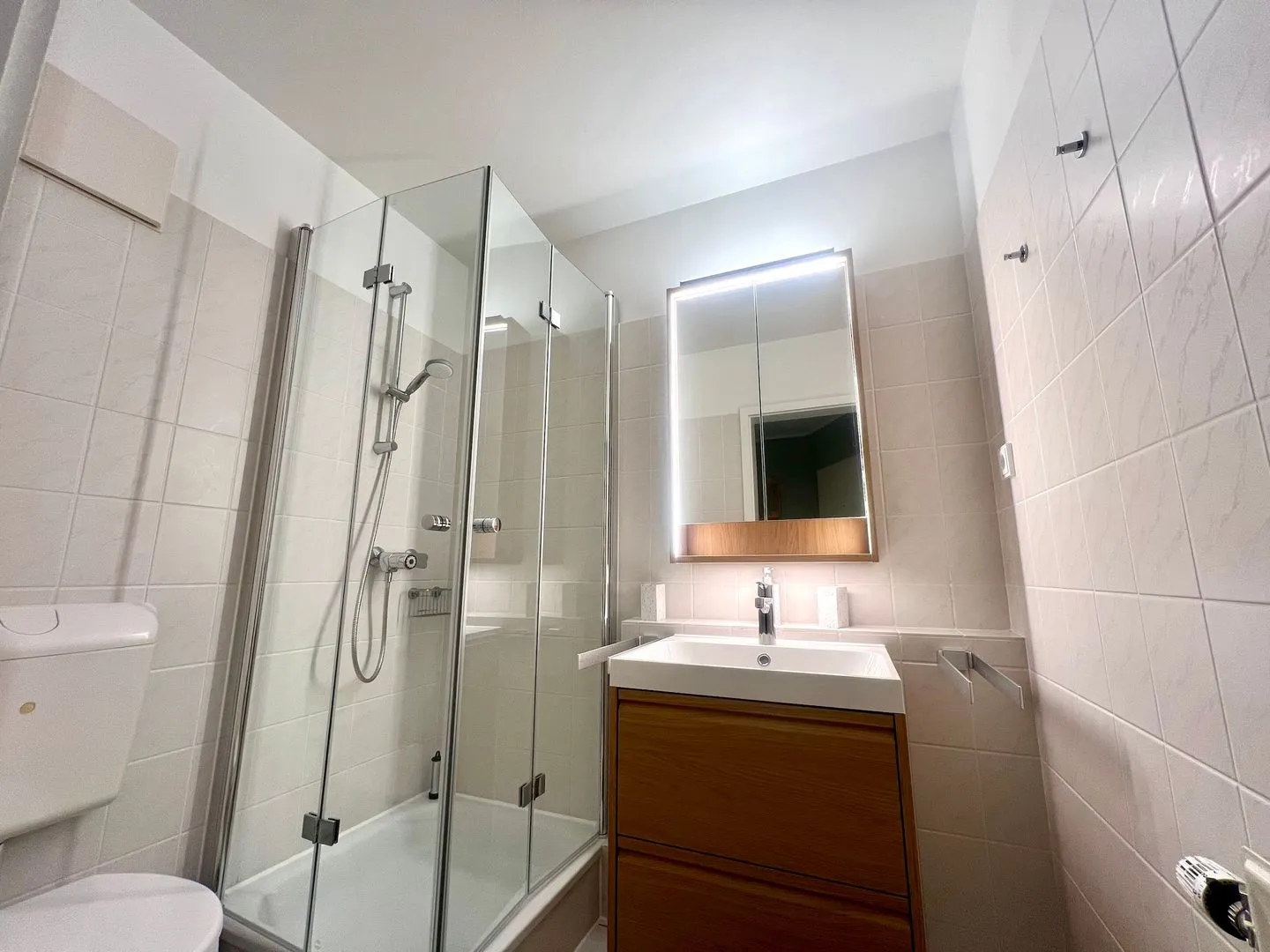 Der offene Wohnbereich mit gemütlicher Couch und rundem Esstisch lädt zum Verweilen ein. Die integrierte Küche ist mit Kaffeemaschine, Geschirrspüler und allem ausgestattet, was Sie für Frühstück oder kleine Mahlzeiten benötigen.